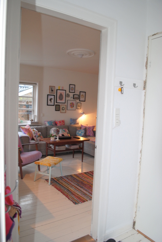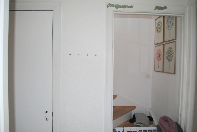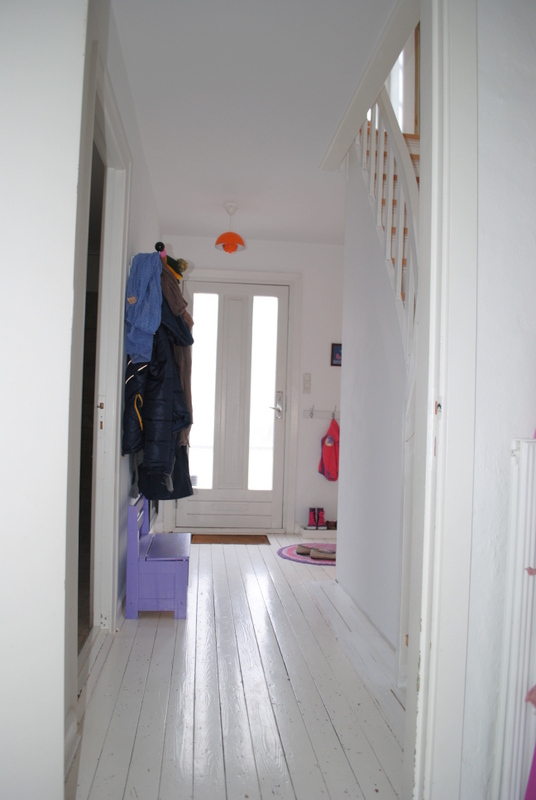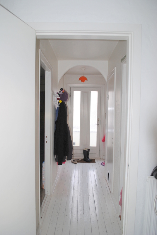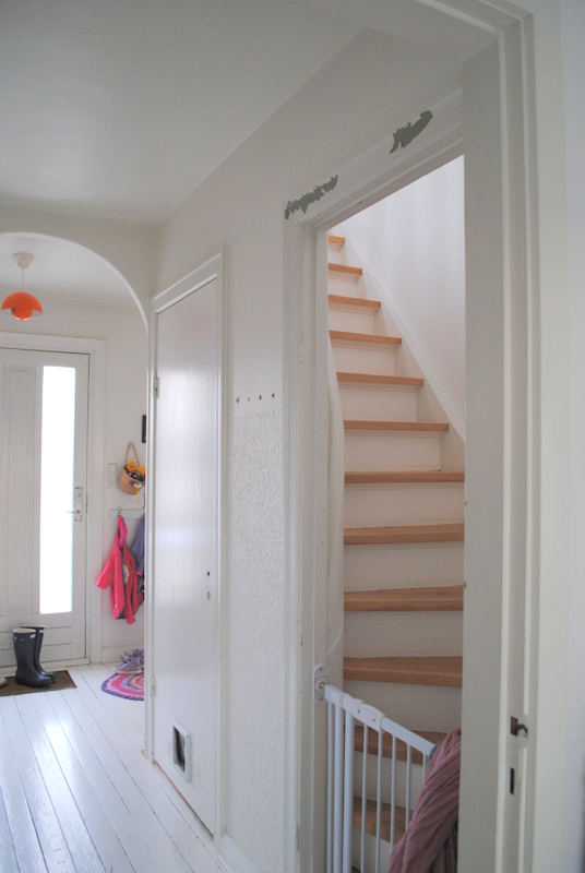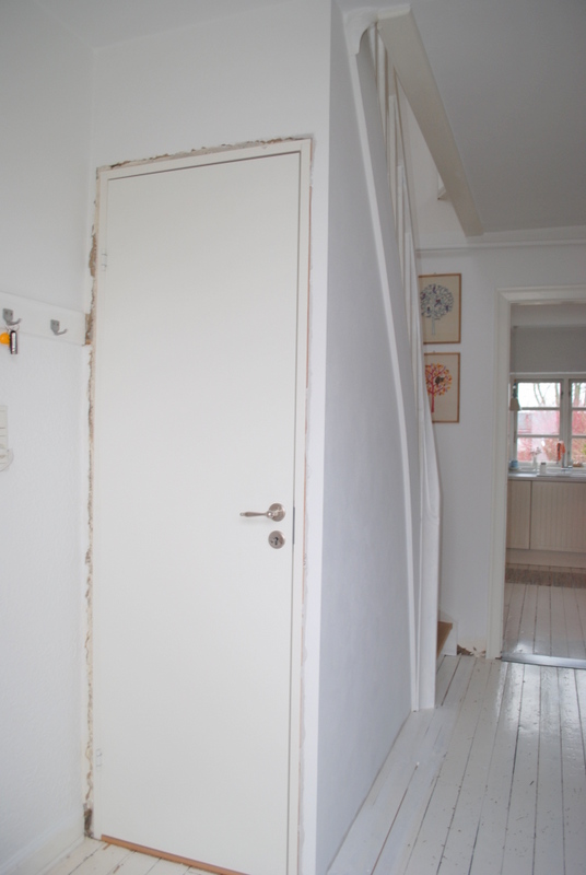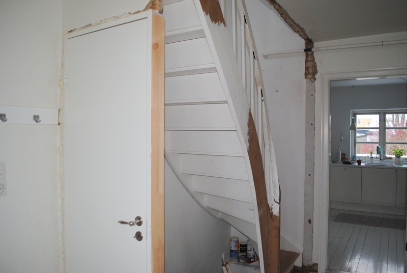 Status pt. er billederne taget herover. Og vi er nu nået til et stadie hvor det hele ligesom bare fungerer igen, det er super dejligt. Gange føles bare meget større og mere luftig nu hvor trappen er synlig og væggen er væk. Døren til kælderen er flyttet om på en anden væg, og det har samtidig givet en smule mere bredde…..