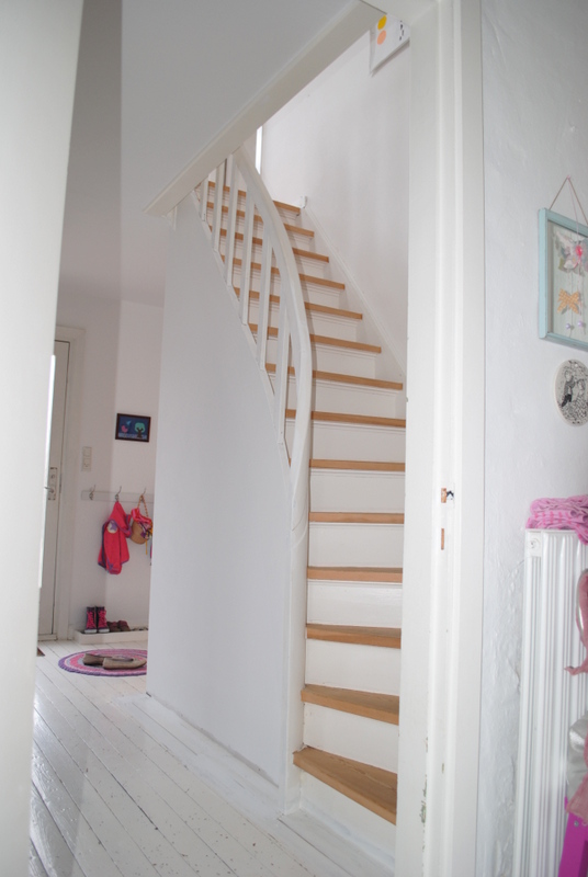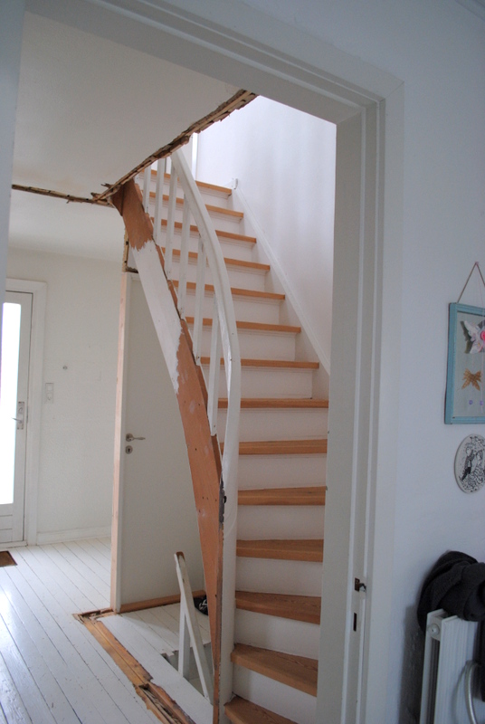 Forud venter nu en masse malerarbejder….. Vi har nemlig tænkt os at forandre looket en del. Gulvet bliver malet i højglans sort, og gelænderet på trappen har jeg fået lov at male lyseblåt…. Jeg glæder mig helt vildt til det en gang står færdigt…. Desuden mangler der også lidt fodpaneler og gerigter…. Men det er småting i forhold til sidste weekend 🙂