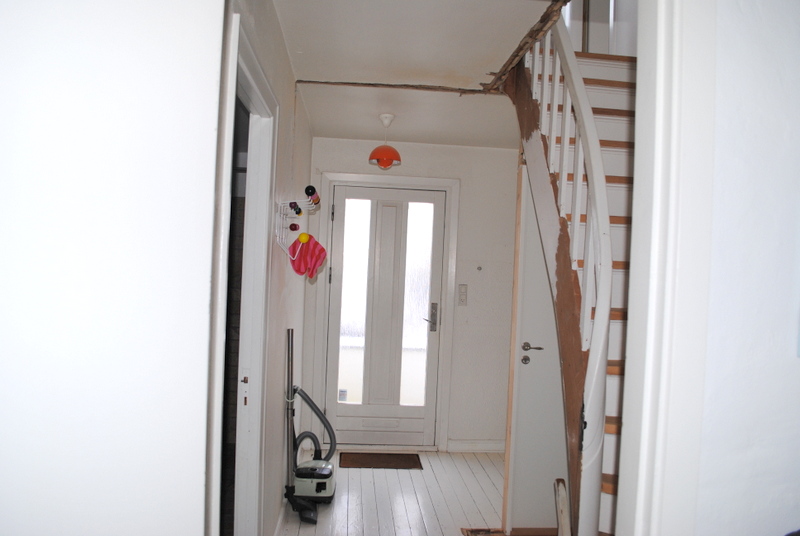 De sidste 2 weekender er gået med hårdt arbejde i vores gang….. Men resultatet er simpelthen sååå godt. Vi bor som bekendt i en ældre murestensvilla, og huset har derfor nogle af de gode ting, som findes i den her slags huse…. Men det har altid undret os, at vores fine trappe ikke var mere synlig….. Jeg har i alle 7 år snakket meget om, om ikke vi kunne prøve at åbne lidt op for trappen, gøre vores indgangsparti en smule større og kønnere….. Men Jesper synes der var andre ting der var vigtigere….. Indtil nu….. Og heldigvis er han også meget meget glad for det, nu hvor det værste er overstået…..