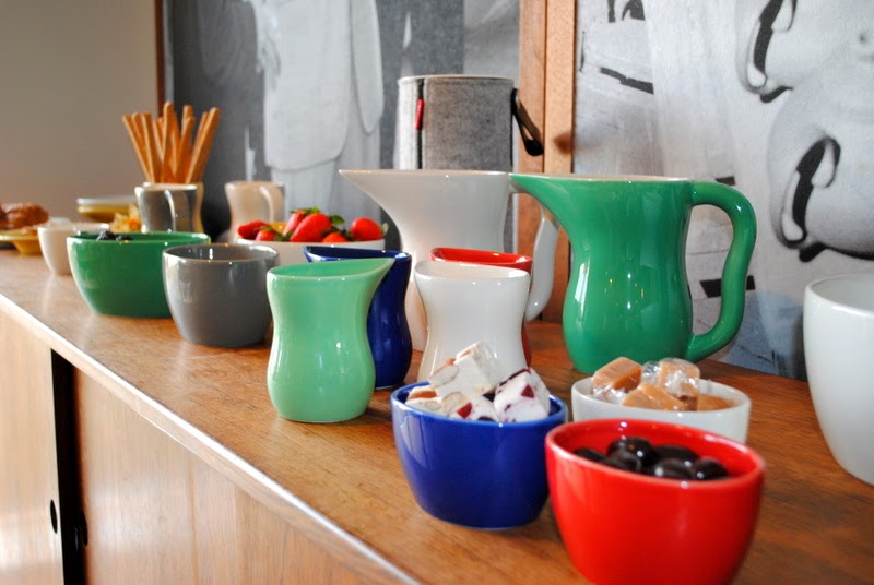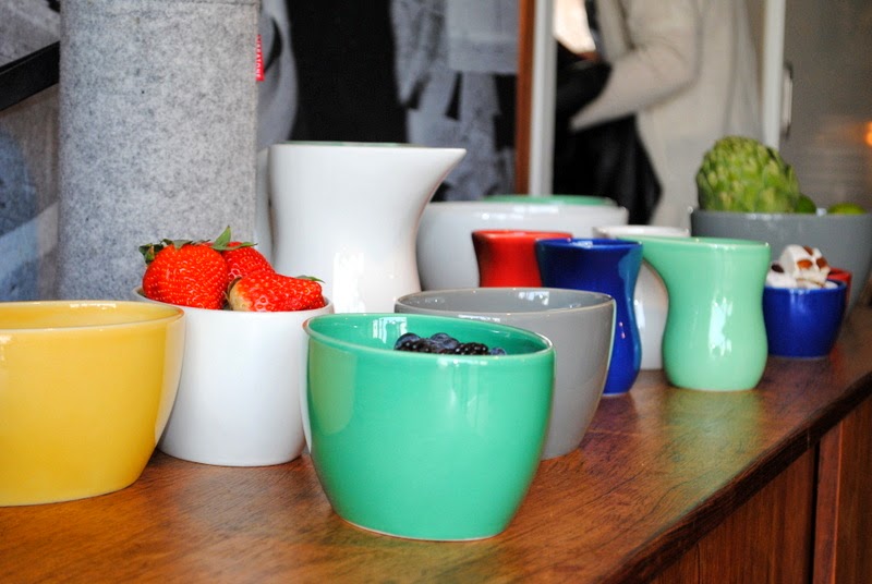 Men årsagen til vores besøg var, at Kähler gerne ville præsentere deres fine nyheder for os. Der var smukt dækket op på bordene, og der var fine udstillinger i hele lokalet. Vi kunne på den måde bevæge os rundt imellem alle nyhederne i eget tempo, vi kunne se og røre og studere det hele.