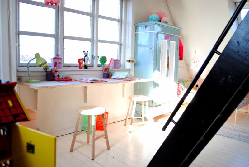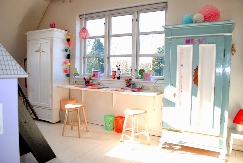 Pigerne dele som bekendt værelse, og det fungerer heldigvis stadigvæk ret godt, de har hver deres ende, og naturligvis også hvert sit legetøj, men de er gode til at dele værelset og til at dele deres sager. Jeg så det derfor også som helt naturligt, at det nye skrivebord skulle være “fælles”.