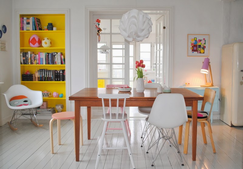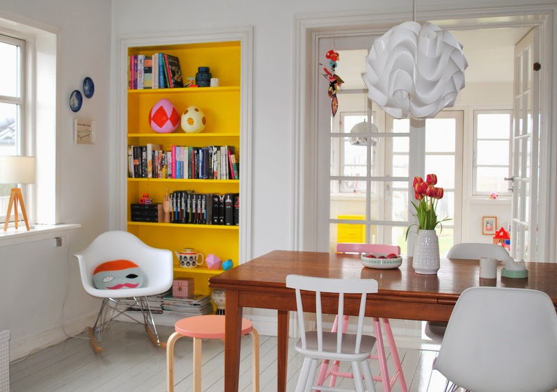 Over den sidste tid har jeg fået en fin gul tråd igennem indretningen. Fordøren er blevet gul, en kommode i vinterhaven er blevet gul, og i sidste uge “gravede” vi reolen i spisestuen frem igen, og også den er blevet gul.