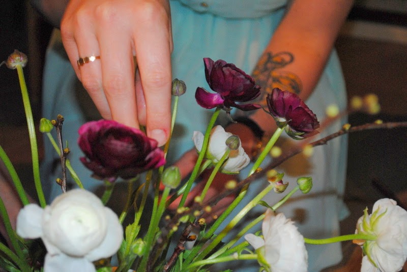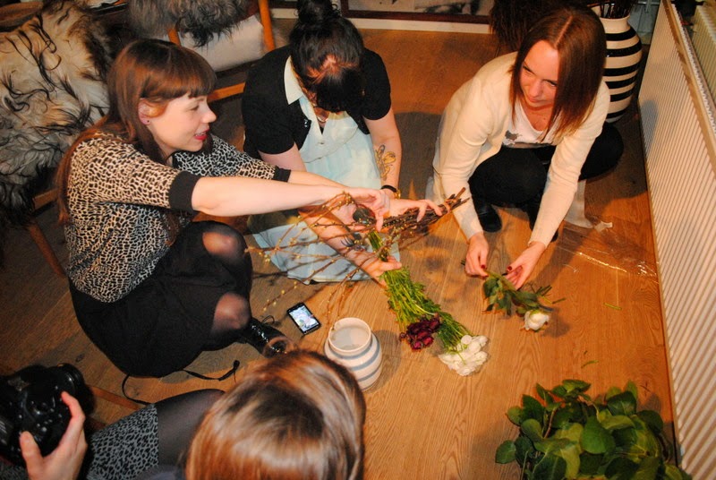 Men sørme om ikke der også var en lille udfordring for os bloggere. Hvert bord fik til opgave at lave en smuk og Kähler inspireret buket. Hver buket skulle senere pynte på bordene hos “de rigtige gæster” inde i restauranten….. Det var så skægt, alle kastede sig over opgaven, og de smukkeste buketter skød op bord efter bord.