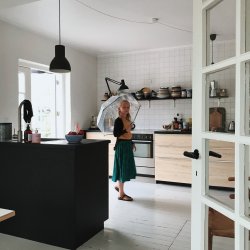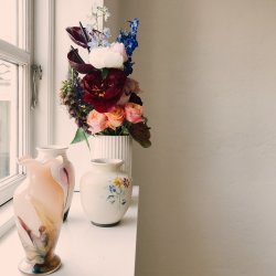 Til slut vil jeg egentlig bare vise jer vores smukke påskebord, jeg havde nemlig plukket årets første pluk selv tulipaner, og de er bare af en helt anden kvalitet end dem man køber, i hvert fald dem fra supermarkedet. Jeg plukkede dem tirsdag, og fredag stod de smukkere end noget andet, og de var kæmpe store. Sammen med dem havde jeg plukket grene fra naboen med både gule og hvide blomster og sat dem i forskellige vaser. Det var simpelthen så fint, og det fik mange roser på instagram. Tusind tak for dem, jeg bliver altid så glad når I kan li det jeg laver 🙂